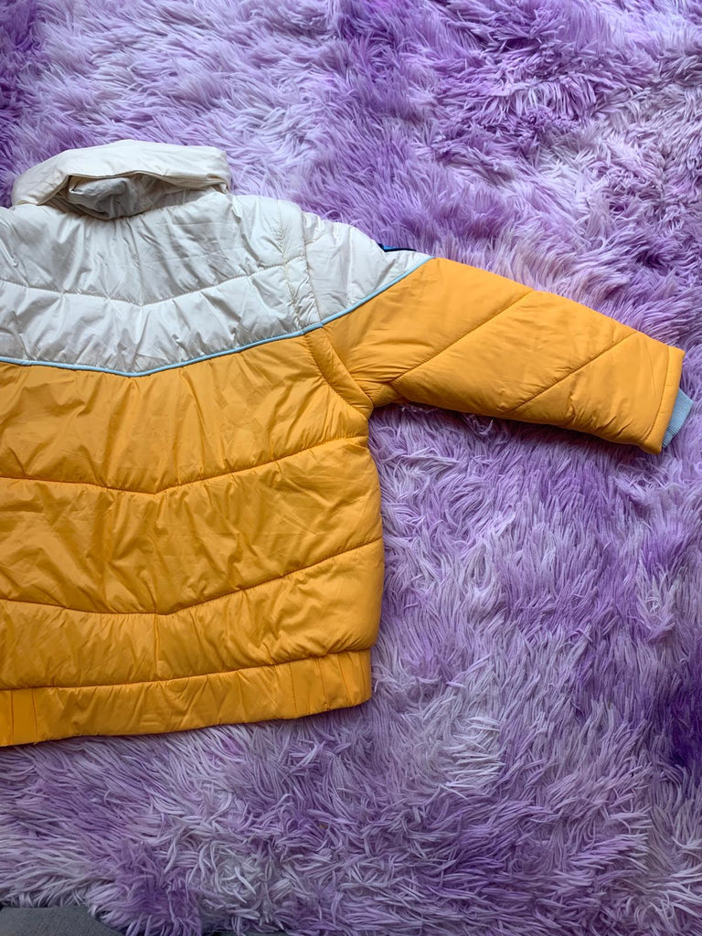 Deze jas van Goldie + Ace (draagmaat 104) heeft een extra leuk nieuw leven gekregen door onze smiley patch. Dit is het enige wat wij hebben toegevoegd aan de jas. Je kan de armen er afritsen en je kan de capuchon opbergen is de kraag. De nieuwprijs van deze jas is 150 euro.