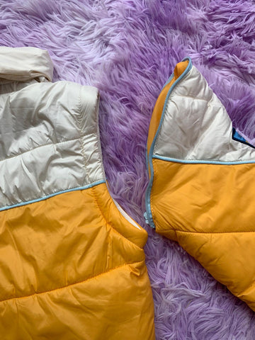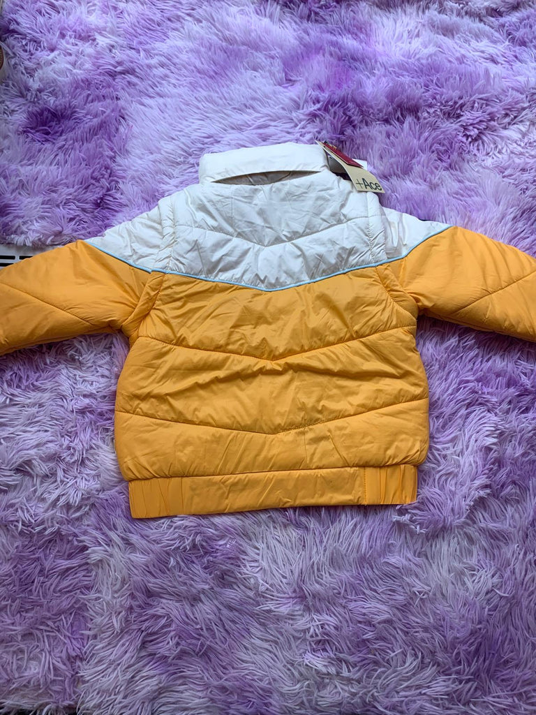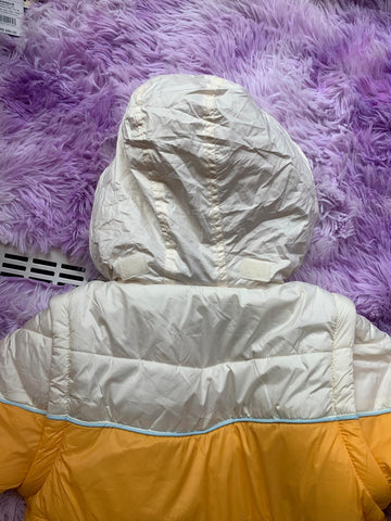 Deze jas van Goldie + Ace (maat 110-116, maar valt meer als 104) heeft een extra leuk nieuw leven gekregen door onze smiley patch. De patch is het enige wat wij aan de jas hebben toegevoegd. Je kan de mouwen afritsen en de capuchon kan je in de kraag opbergen. Op de achterkant zitten een paar kleine vlekjes.