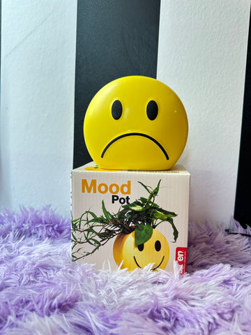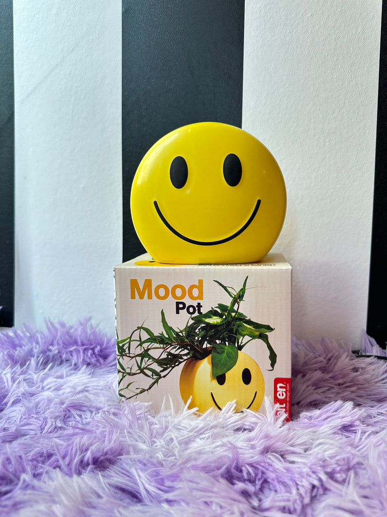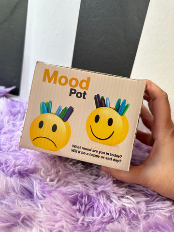 Leuke mood pot met een blije en een verdrietige kant, in het licht roze en geel. leuk als pennenbakje maar ook om andere leuke dingen in te doen.