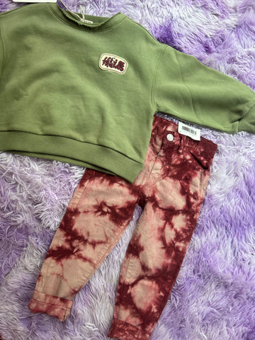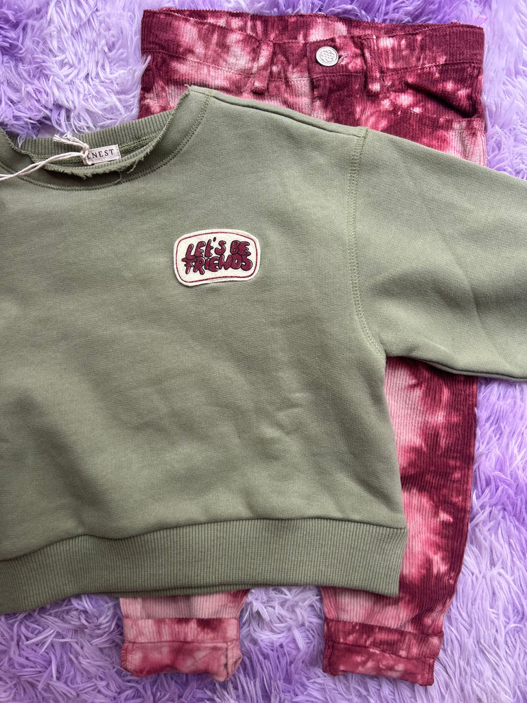 Deze nieuwe sweater van Jenest (maat 98-104, valt als 98) heeft een extra leuk nieuw leven gekregen door onze nieuwe Let’s Be Friends print. Hij wordt gecombineerd met een tof corduroy broekje van The Campamento (mt 92, maar draagt echt als een 98). Kan worden versteld in de taille.